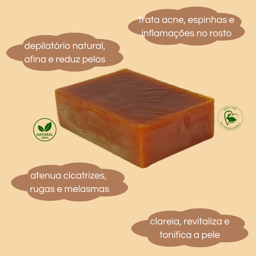 Produzido com ingredientes de origem vegetal, o sabonete é 100% vegano, livre de corantes artificiais e elaborado com açafrão, dolomita, extrato de barbatimão, lauril vegetal de coco e essência.