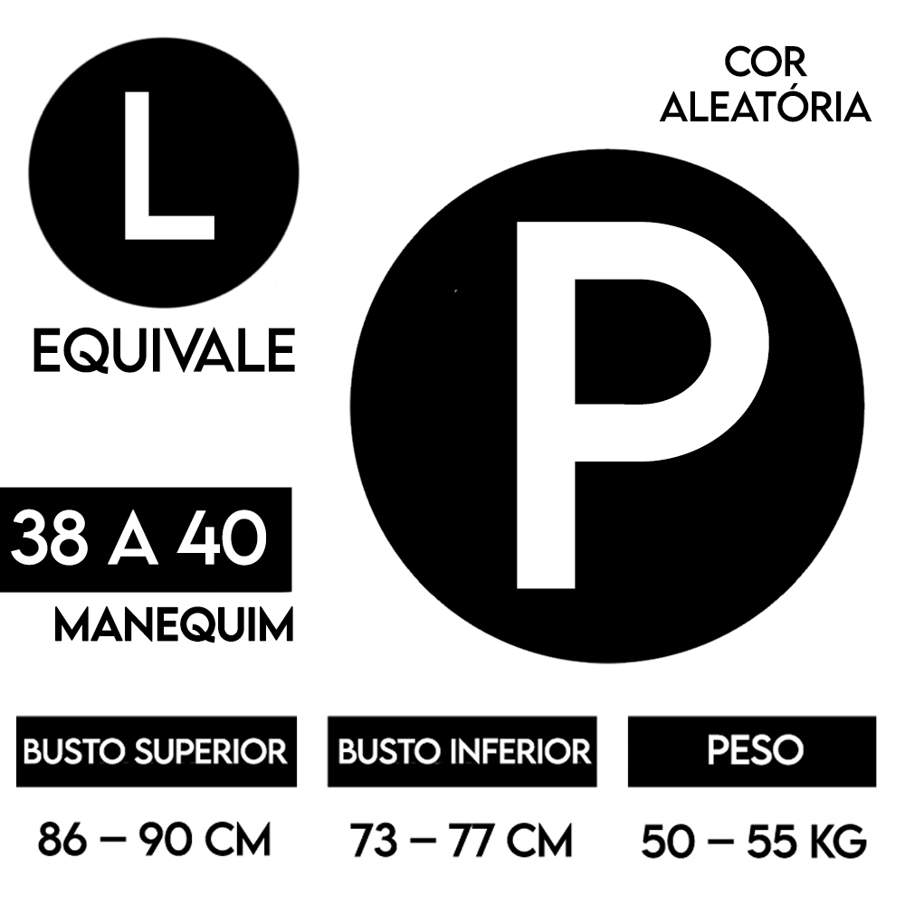 • GG: Busto Superior: 91 a 95 cm | Busto Inferior: 78 a 82 cm | Peso: 55kg - 60kg