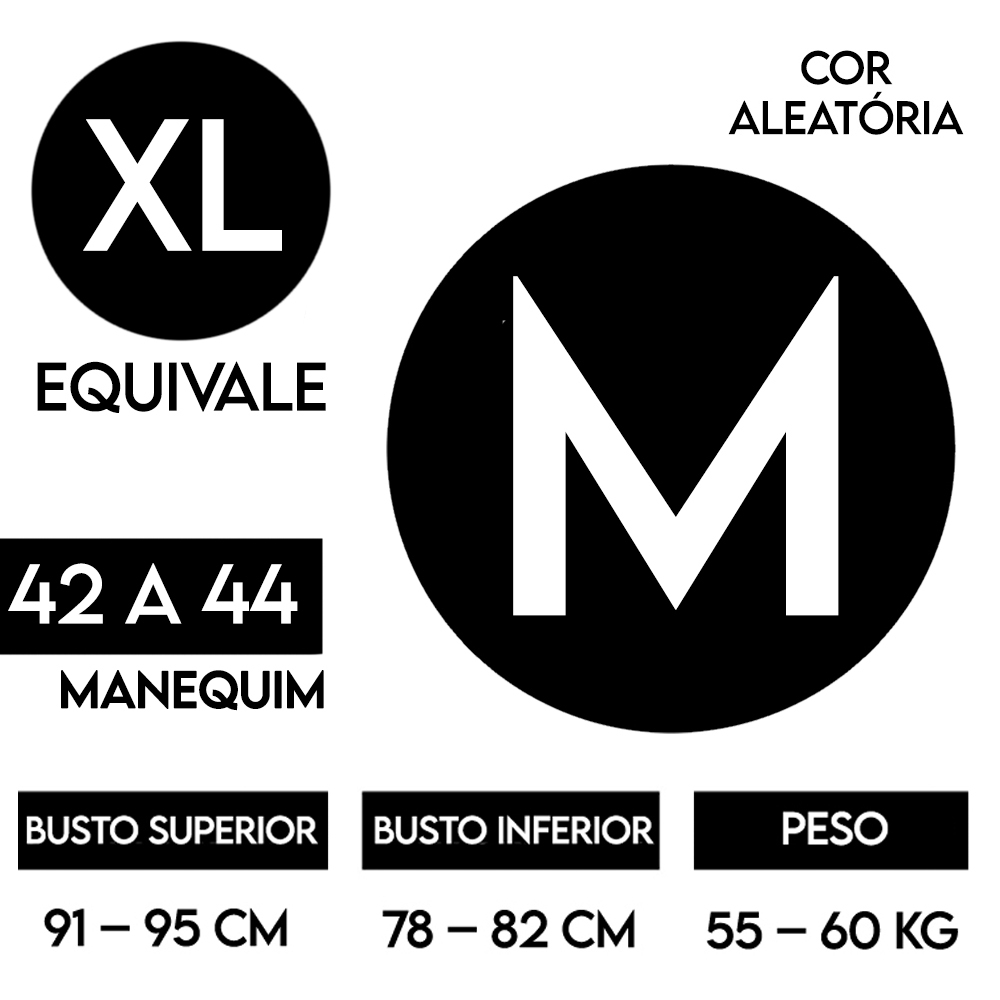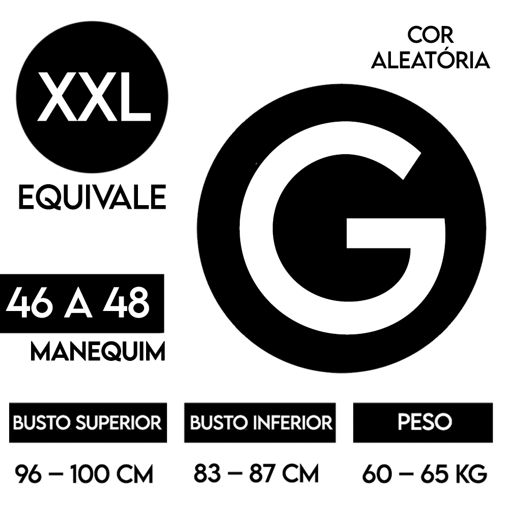 • XG: Busto Superior: 96 a 100 cm | Busto Inferior: 83 a 87 cm | Peso: 60kg - 65kg
